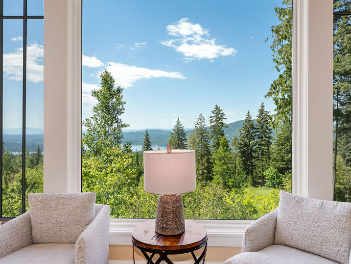 The picturesque dining area commands attention with its corner positioning, where postcard windows frame views of pristine Whitefish Lake and the meticulously manicured fairways that roll through the forested landscape below. The generous proportions accommodate a substantial dining table, while the dual-aspect windows create an ever-changing backdrop of Montana's natural splendor.